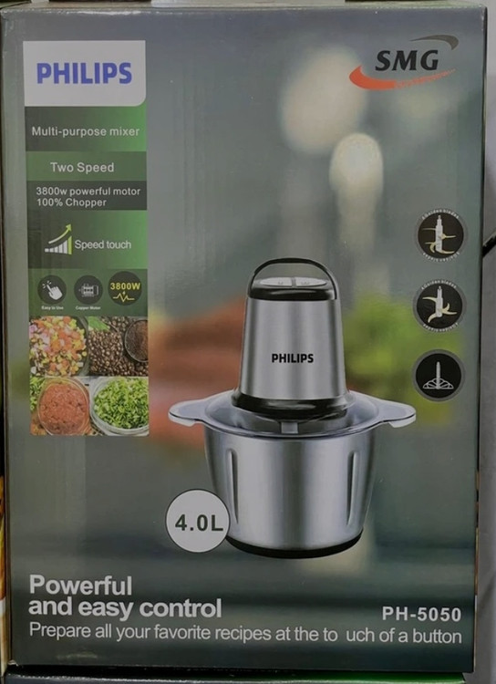 خردکن کاسه استیل فیلیپس- ظرفیت 4 لیتری 6+4 تیغه تیتانیوم طلایی همراه با همزن و کاردک- قدرت 3800 وات- مدل PH-5050